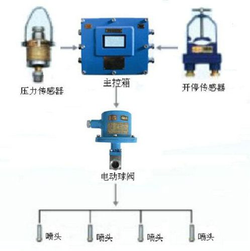 只有水壓傳感器檢測到采煤機(jī)水采水路中有一定的水壓(或工作燈開啟)時(shí),才能允許啟動采煤機(jī)。采煤機(jī)開動后,開停傳感器(或光控傳感器)將信號送入主控箱,主控箱控制電動球閥開啟,實(shí)現(xiàn)對產(chǎn)塵點(diǎn)進(jìn)行噴霧降塵。采煤機(jī)停機(jī)(或采煤機(jī)工作燈關(guān)閉)后,主控箱控制電動球閥延時(shí)一定的時(shí)間后關(guān)閉,停止噴霧降塵。